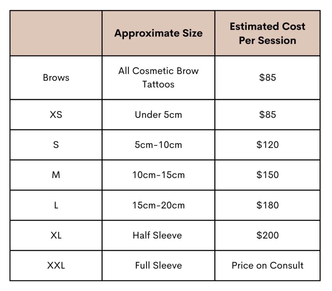 Example: You need five sessions to start and your tattoo is 8cm. 5x $120 = $600 - 10% = $540 total.